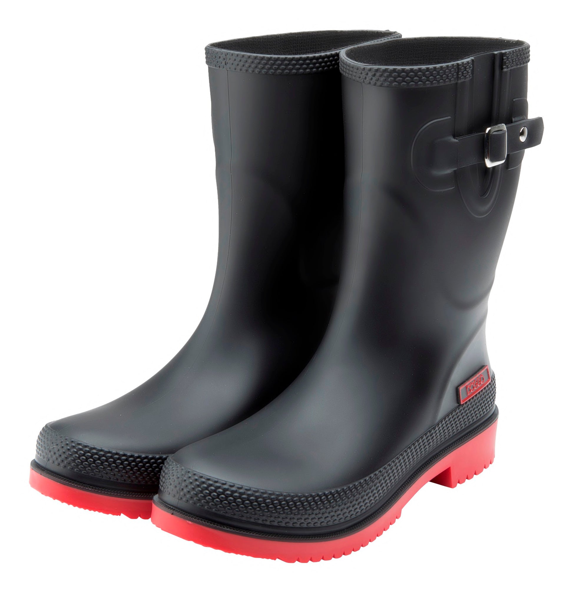 Fashionable DOGGO ladies PVC boots, 3/4 high , with color-coordinated outsole and side-mounted decorative buckle. The tried and tested fit guarantees a pleasant ride. The non-slip and non-slip outdoor sole helps you walk in the rain or over the wet meadow.